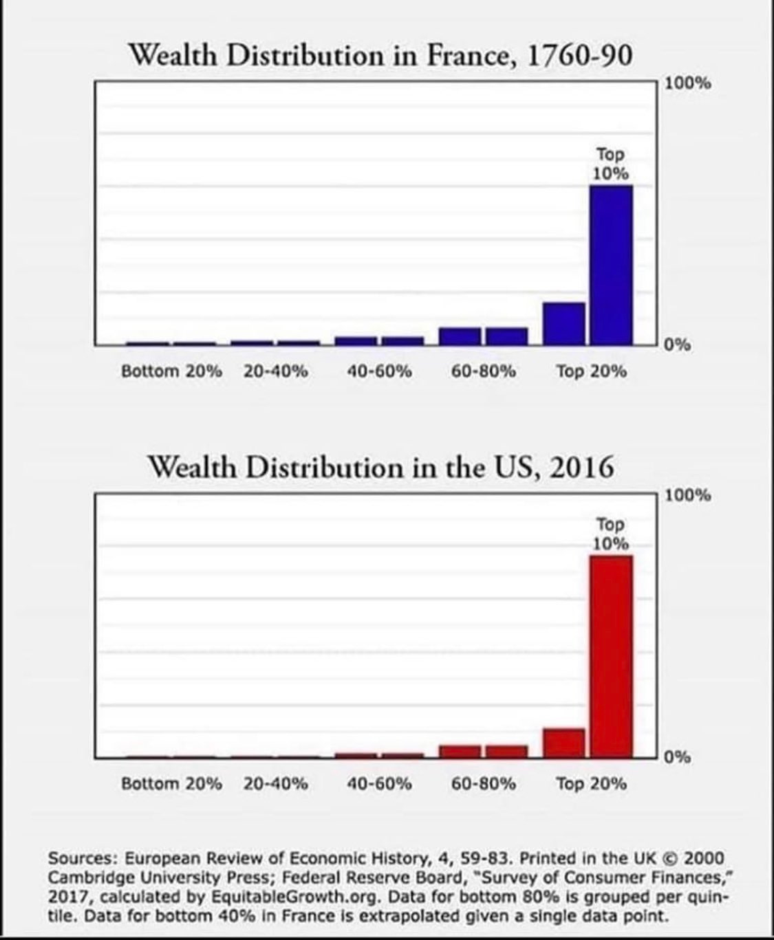 Speaking of collapse, today is Bastille Day, which commemorates the storming of the Bastille, the event that formally started the French Revolution. The Bastille was a Parisian armory and political prison that symbolized the oppressive power of king Louis XVI’s Bourbon dynastic monarchy. Eighteenth century, monarchic France was plagued by gross wealth inequality between the aristocracy and commoners, high inflation spurred by massive debt (state debt rose threefold during the reign of Louis XVI), engagement in wars they couldn’t afford (especially the American Revolution), high taxes, and a poor harvest. Basically, the same conditions of the United States today.